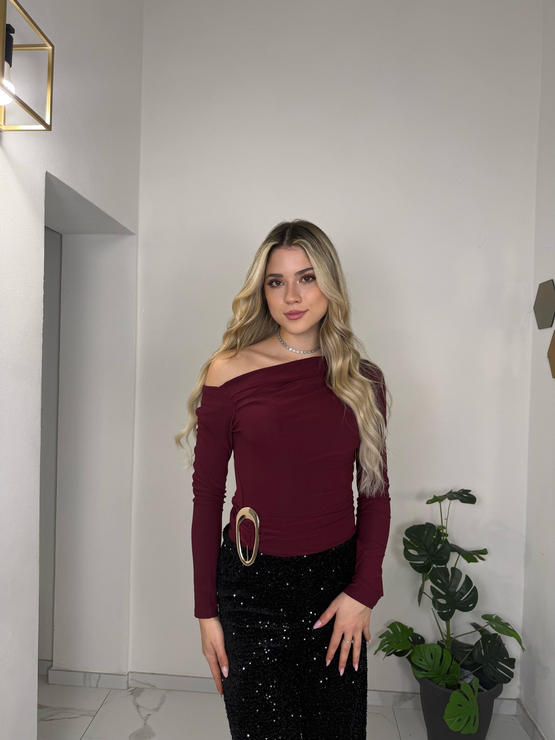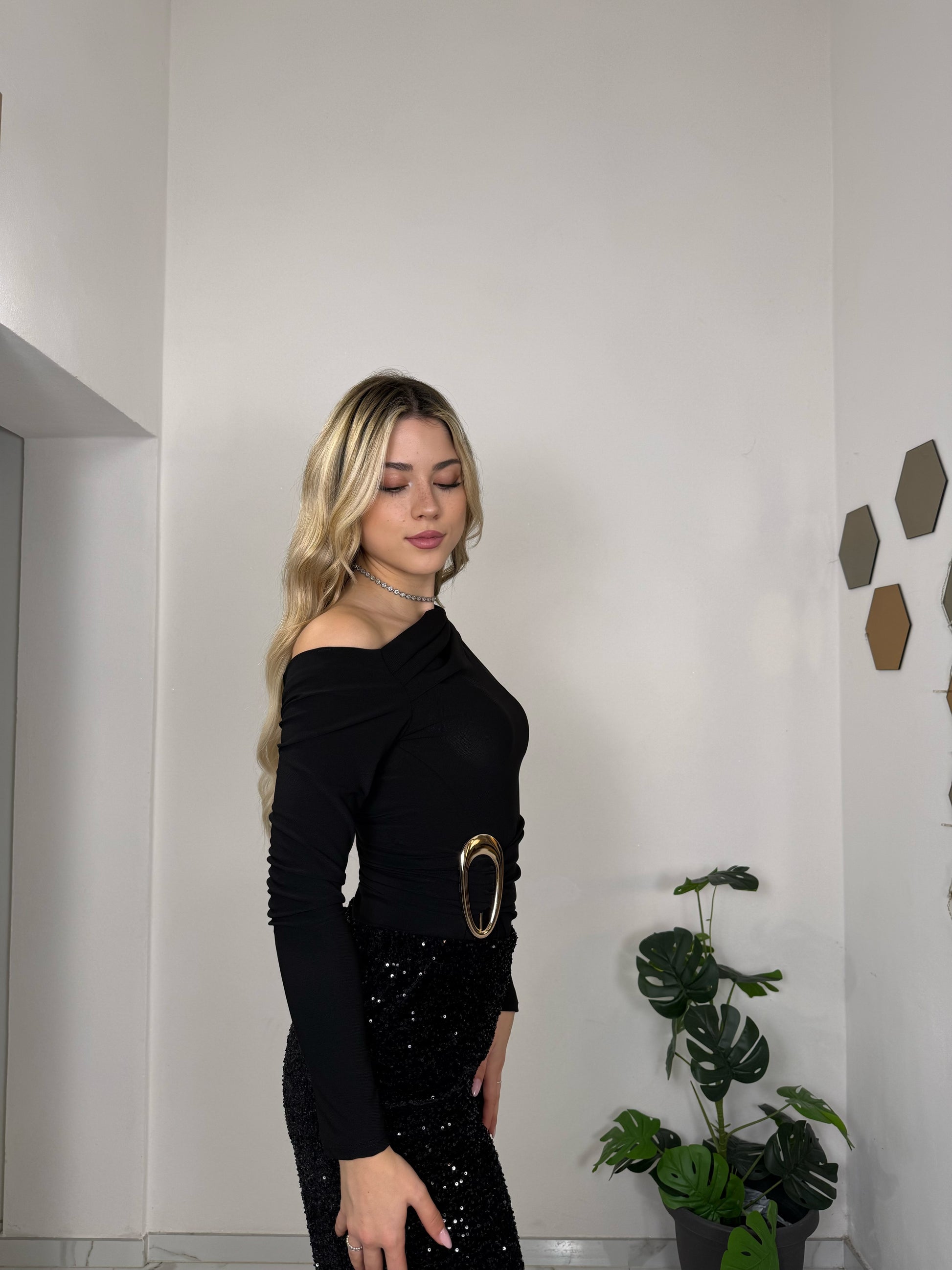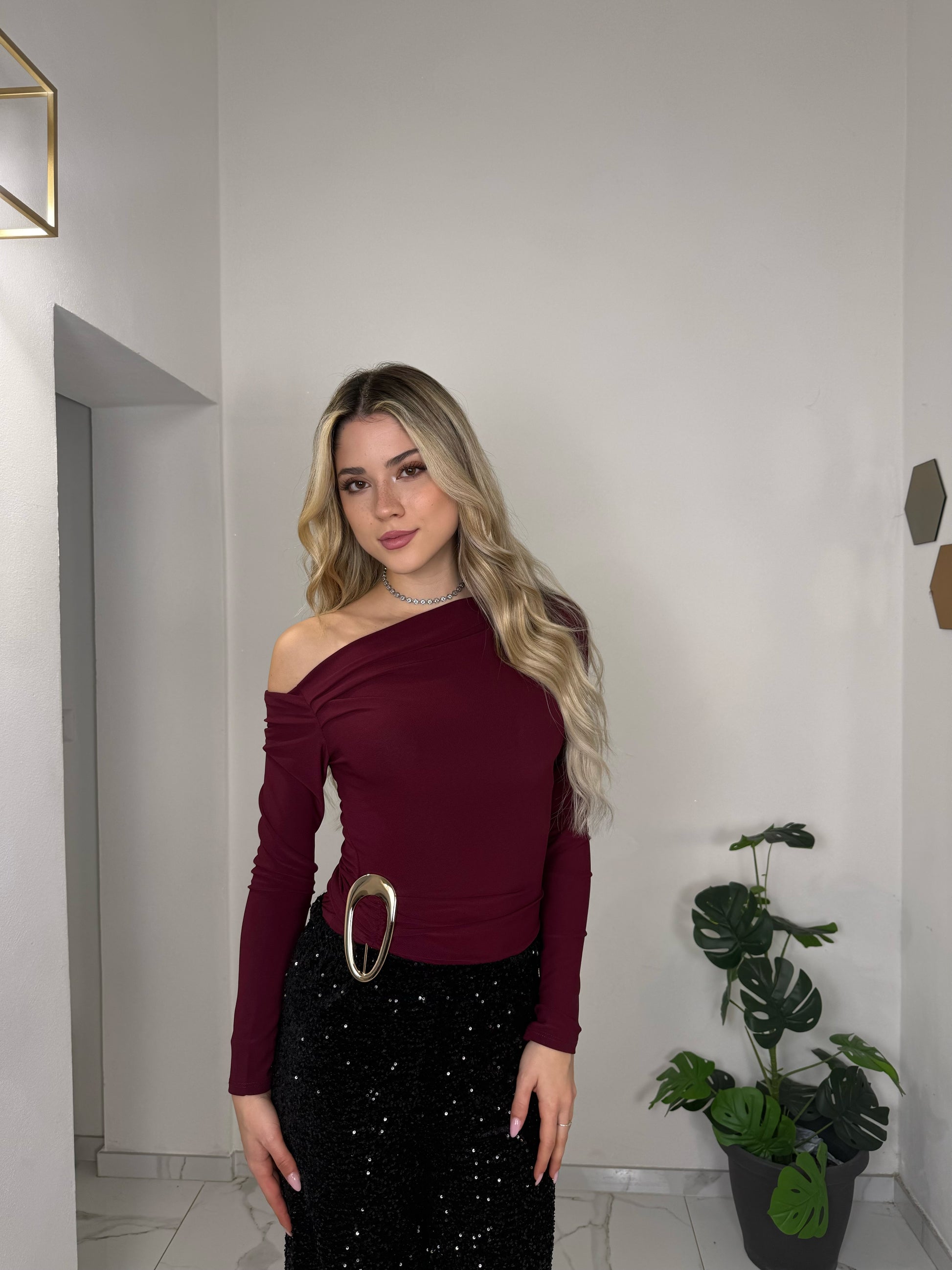 Body monospalla a manica lunga con drappeggio laterale, perfetto per valorizzare la silhouette con classe. Il tessuto morbido e leggermente elasticizzato lo rende comodo da indossare e ideale per occasioni speciali. Raffinato, femminile e facile da abbinare a gonne o pantaloni eleganti.