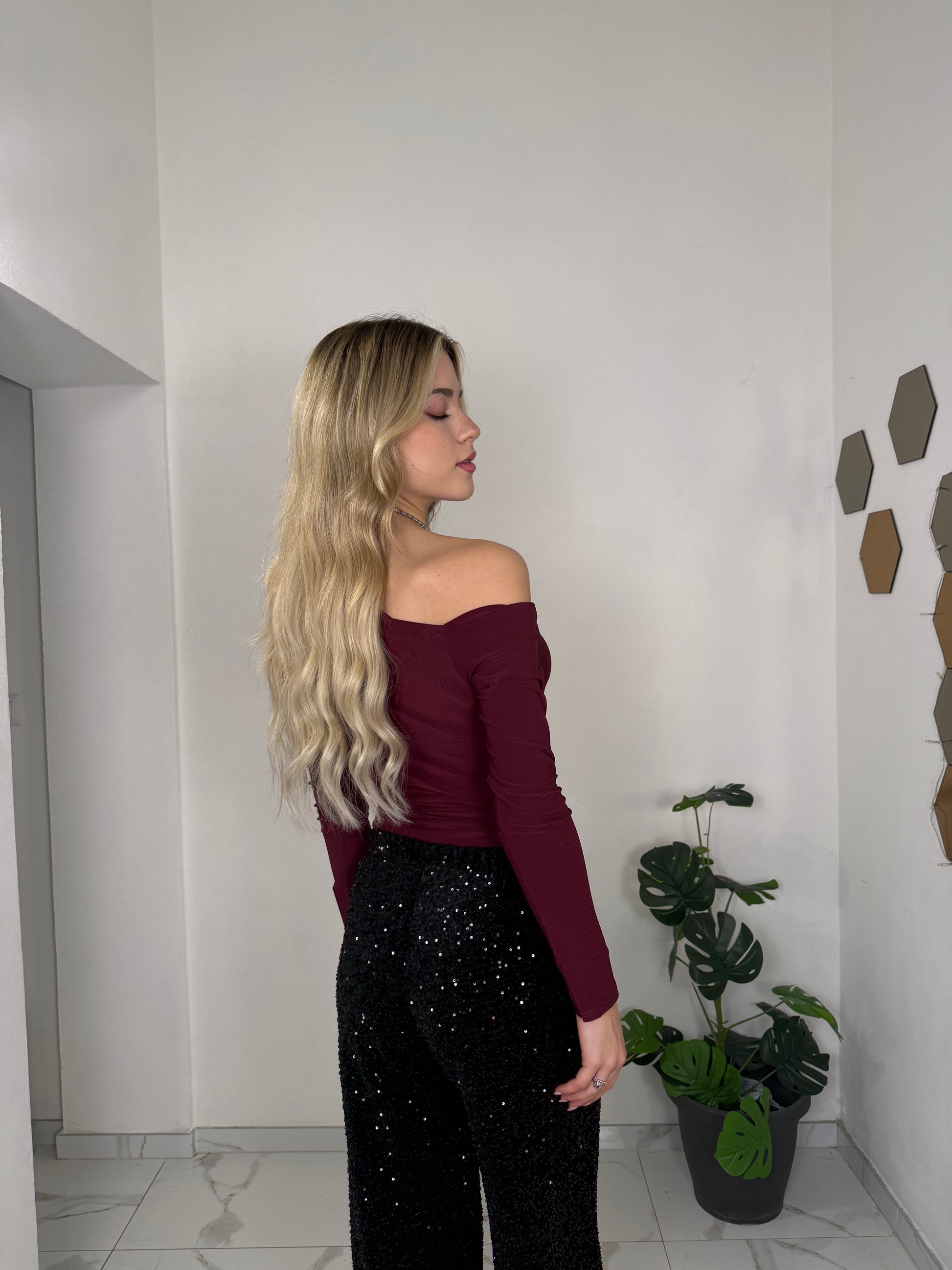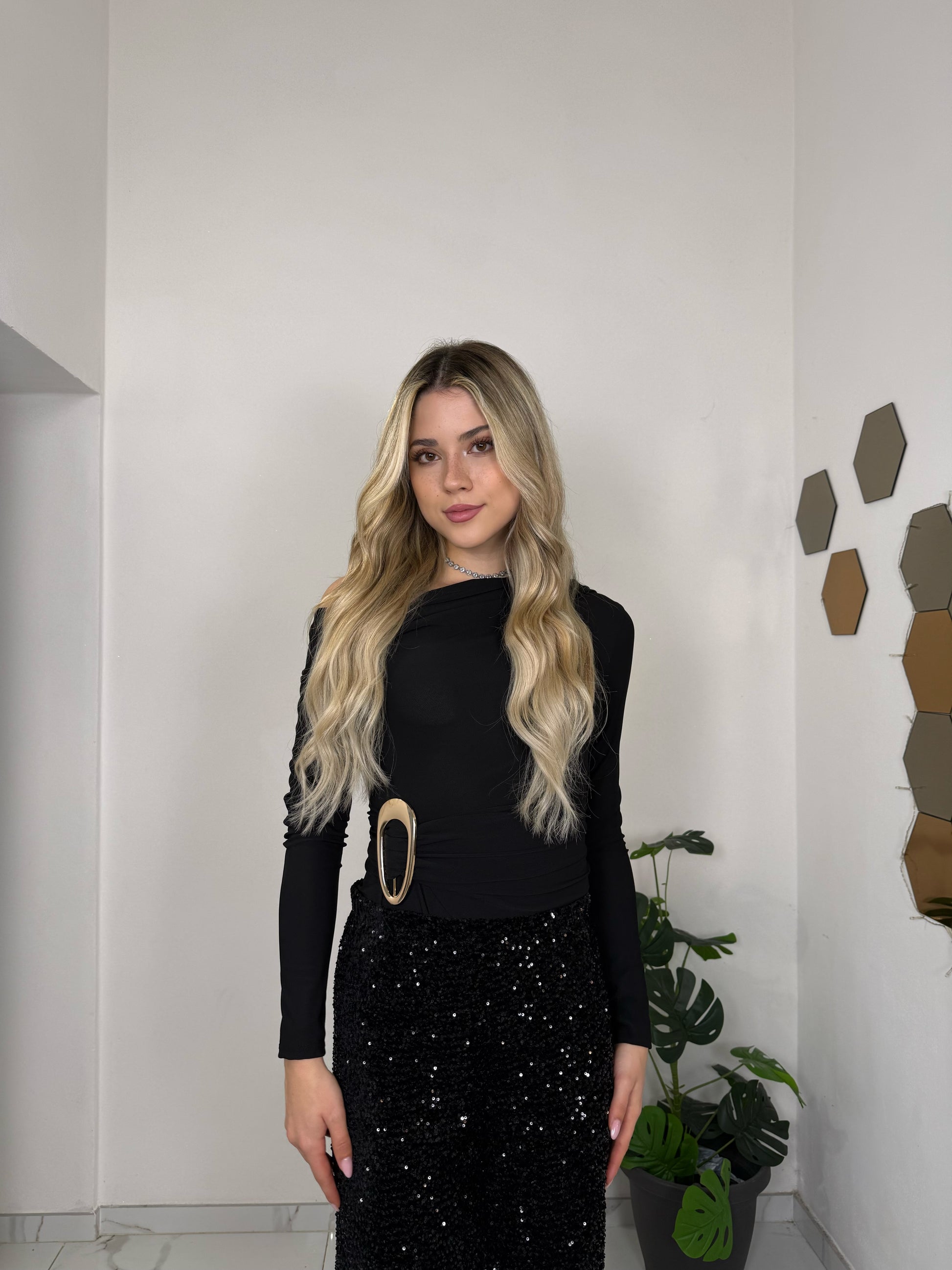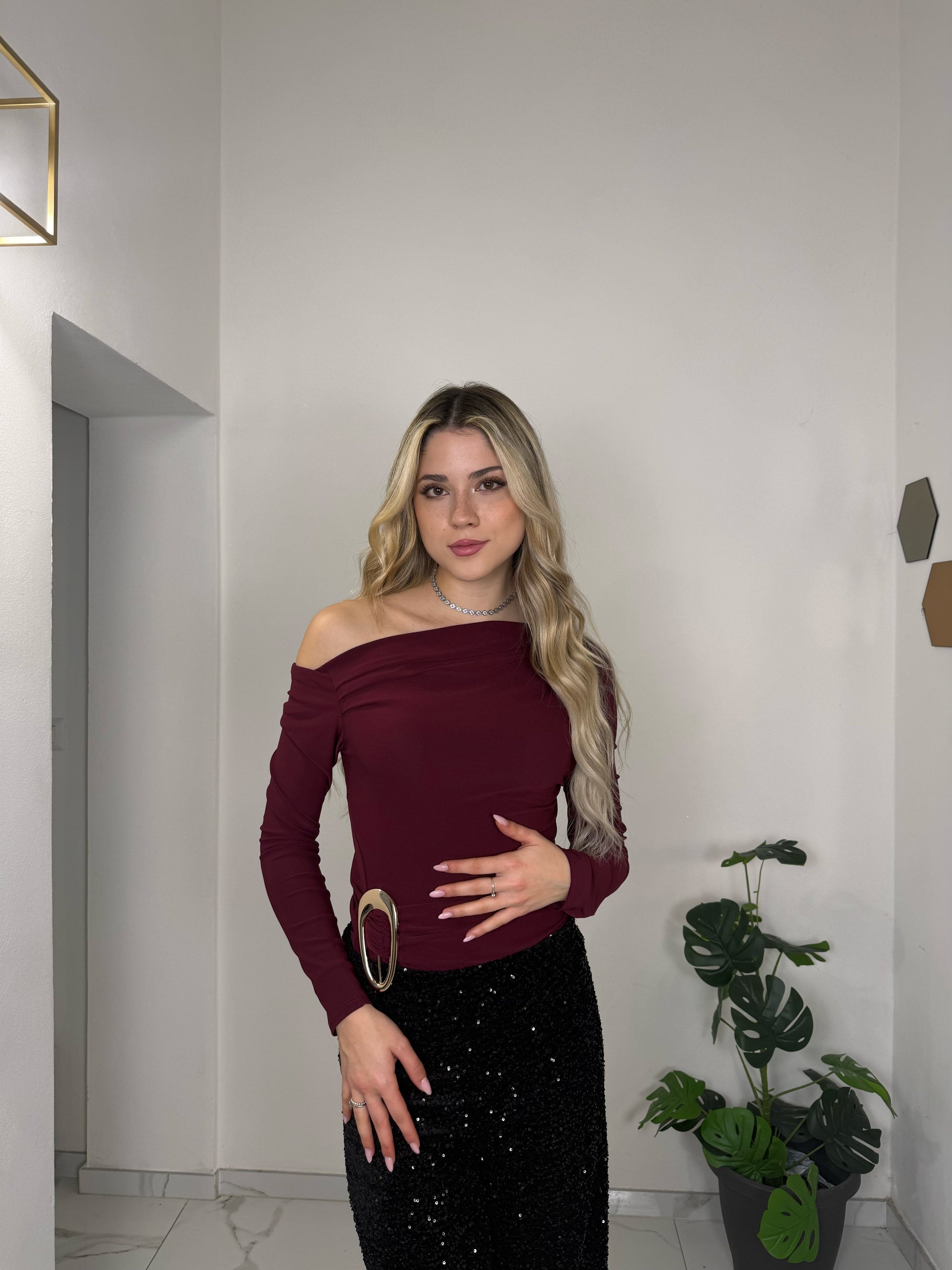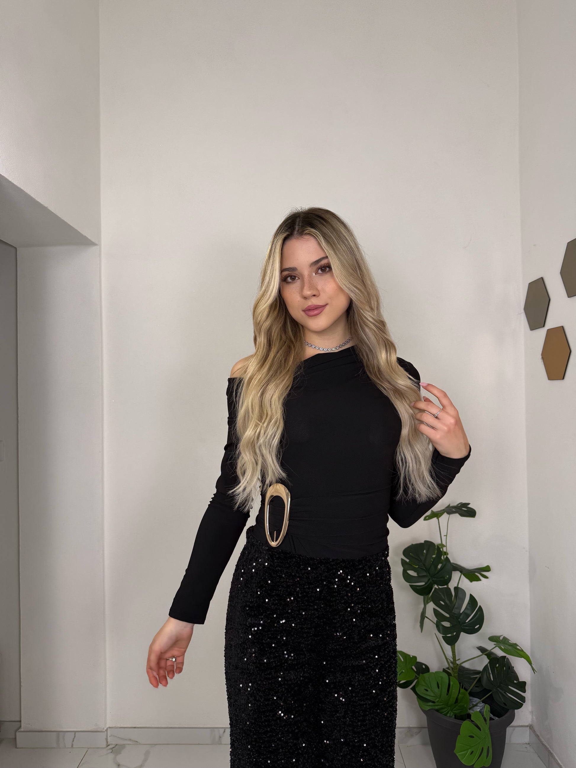 Body monospalla a manica lunga con drappeggio laterale, perfetto per valorizzare la silhouette con classe. Il tessuto morbido e leggermente elasticizzato lo rende comodo da indossare e ideale per occasioni speciali. Raffinato, femminile e facile da abbinare a gonne o pantaloni eleganti.