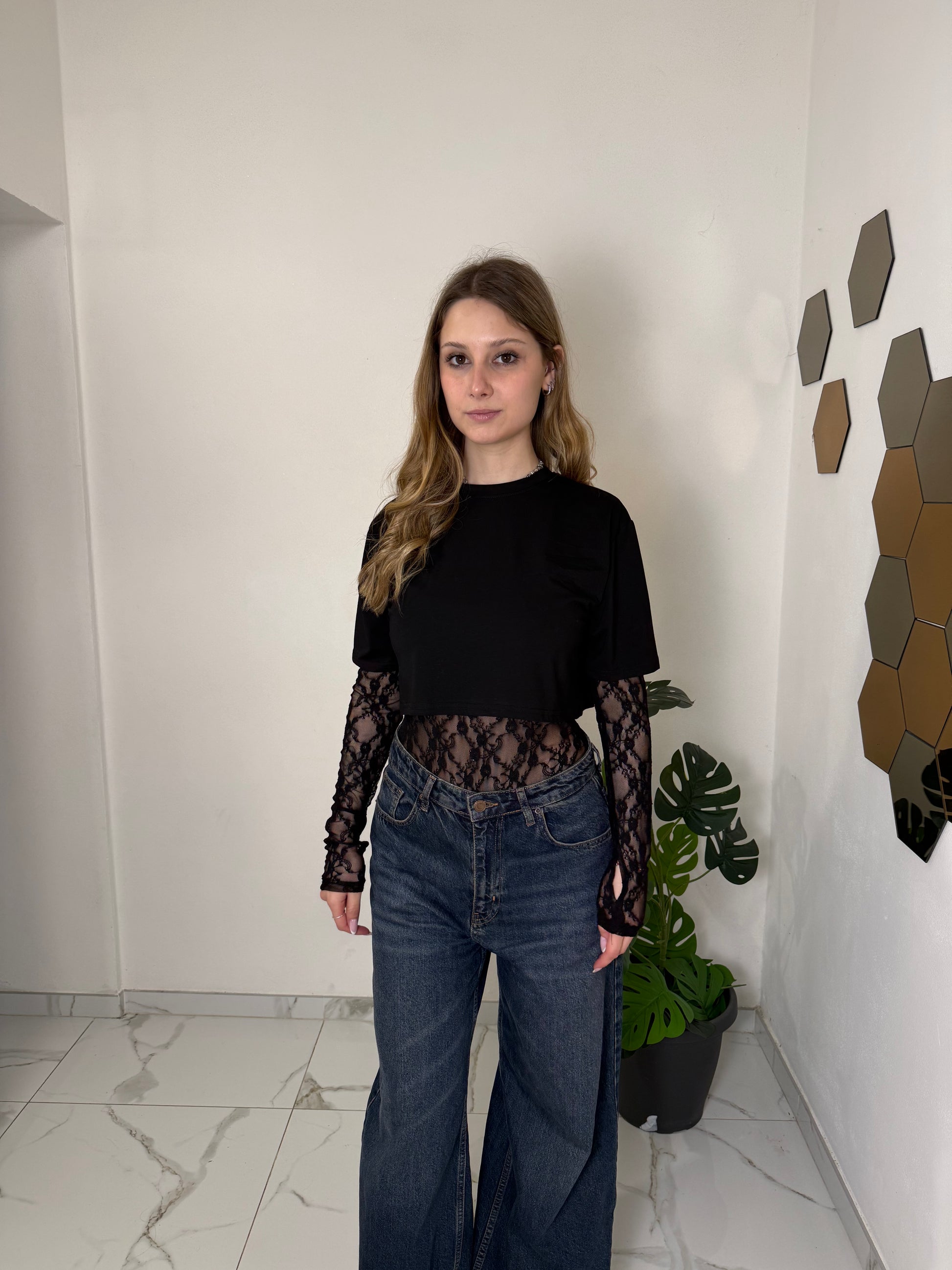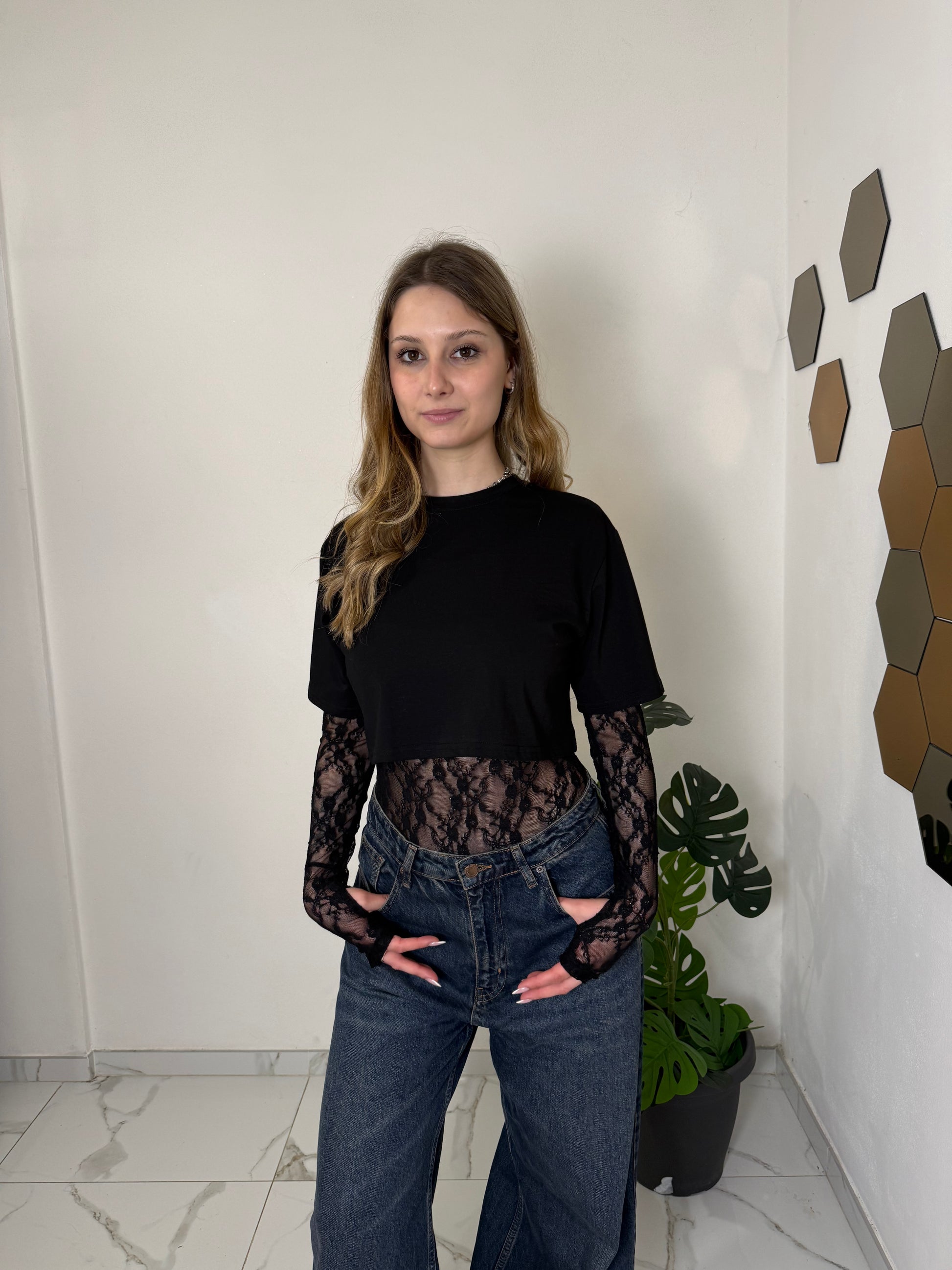 Dettagli: body con maniche in pizzo, manica a guanto, t-shirt abbinata effetto layering