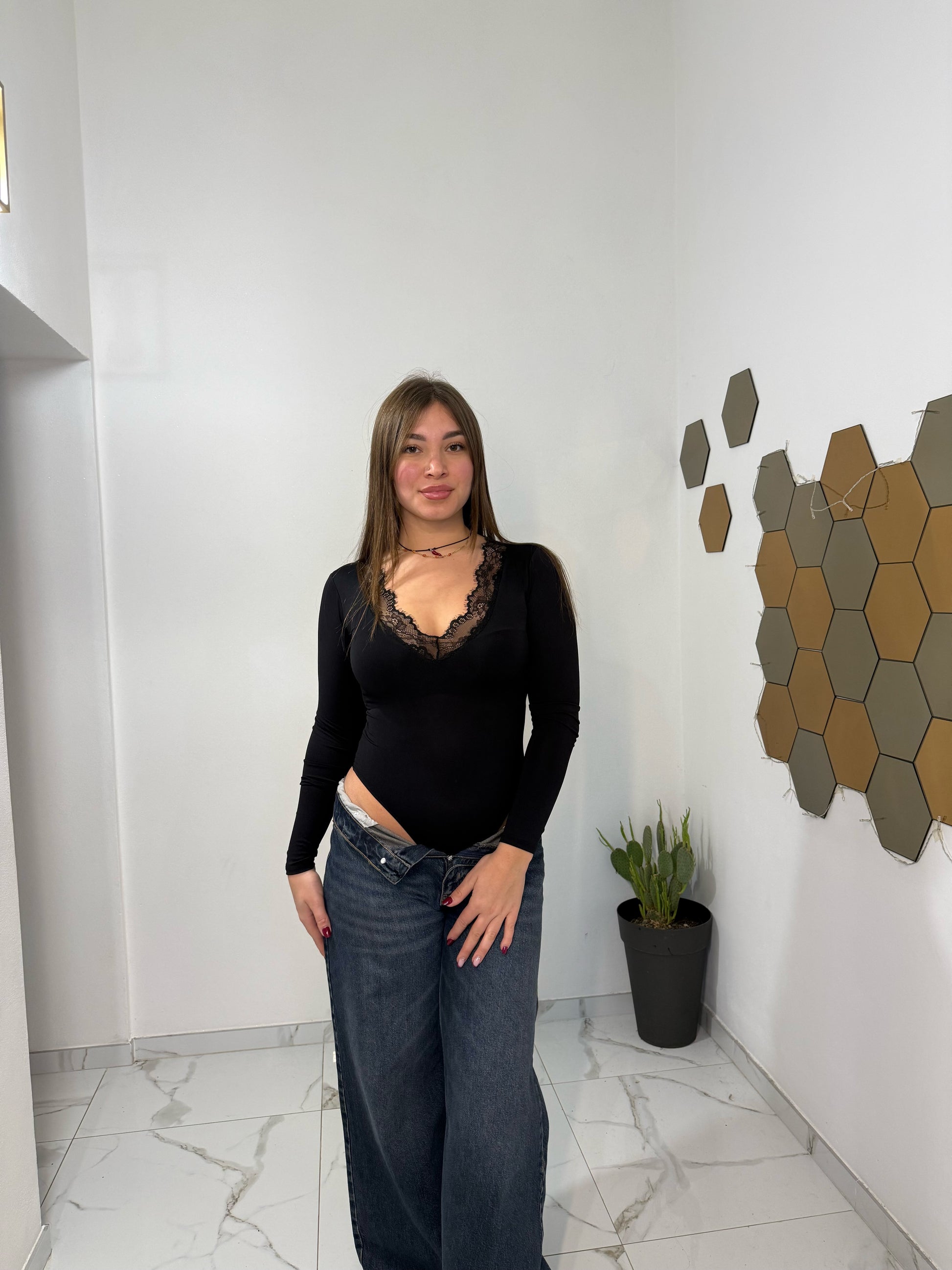 Scollatura a V con delicato inserto in pizzo, maniche lunghe e tessuto morbido ed elasticizzato che valorizza ogni silhouette. Perfetto da solo o abbinato a un blazer per un look chic e senza tempo.