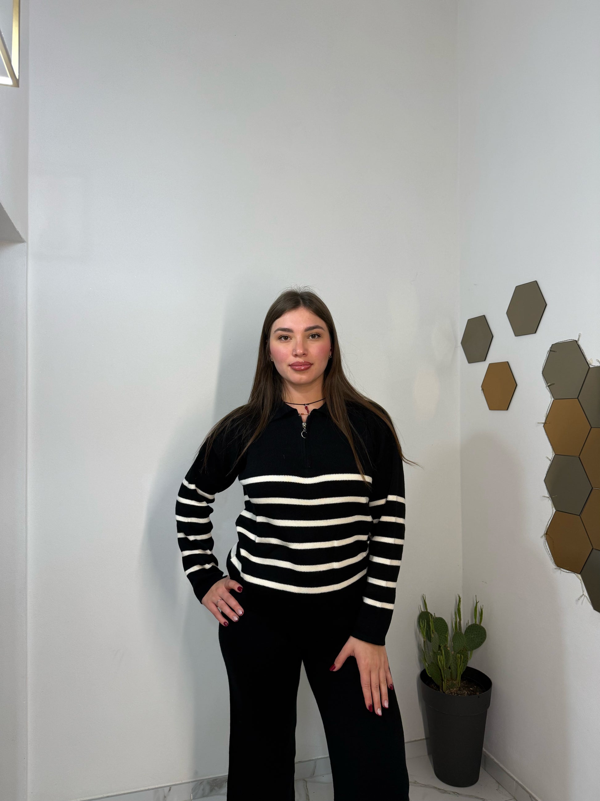 Coordinato in acrilico composto da maglione con zip e pantaloni a gamba larga, perfetto per le giornate di relax o per un look casual chic. Realizzato in tessuto morbido e caldo, ideale per la stagione fredda.