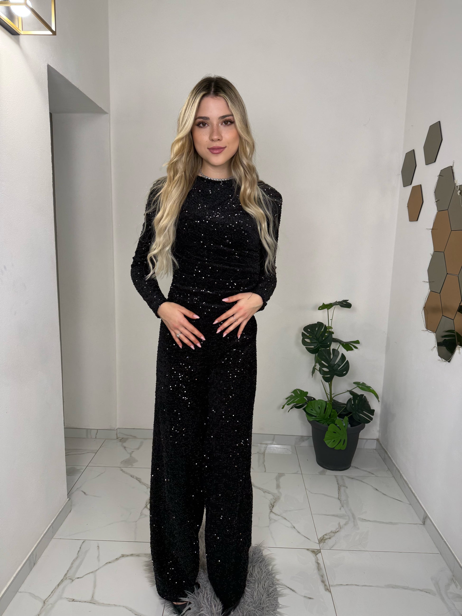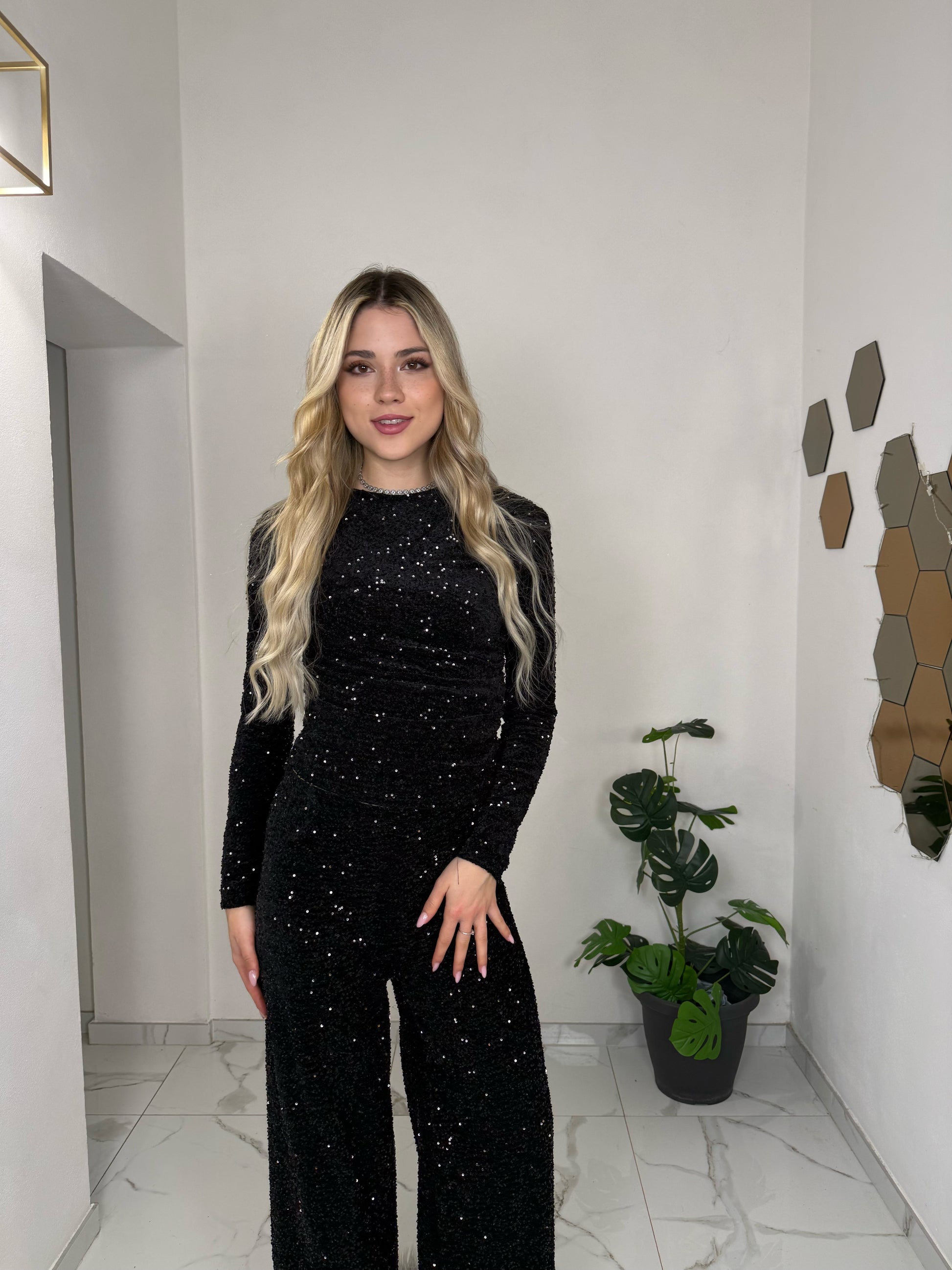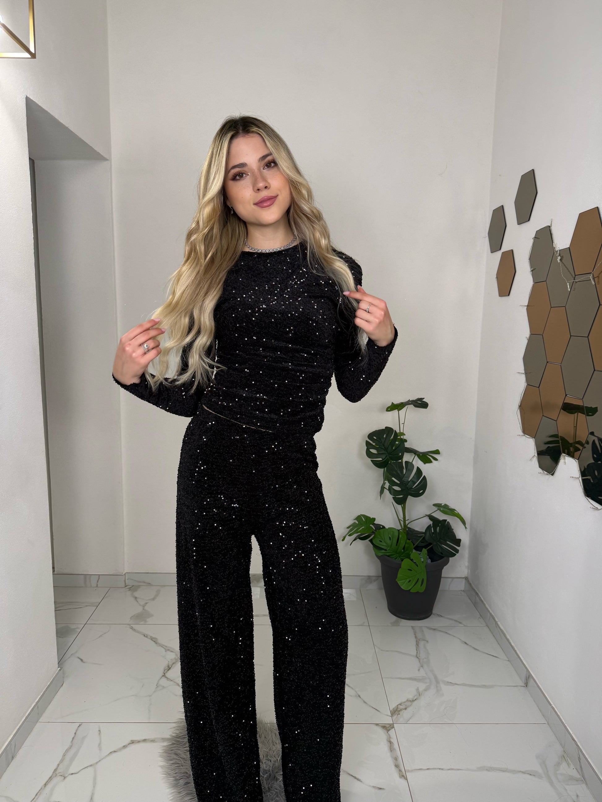 Coordinato in tessuto scintillante con maniche lunghe e pantalone a gamba larga. Realizzata con materiali morbidi e leggermente elasticizzati, è perfetta per serate speciali o per chi ama distinguersi con eleganza e stile.