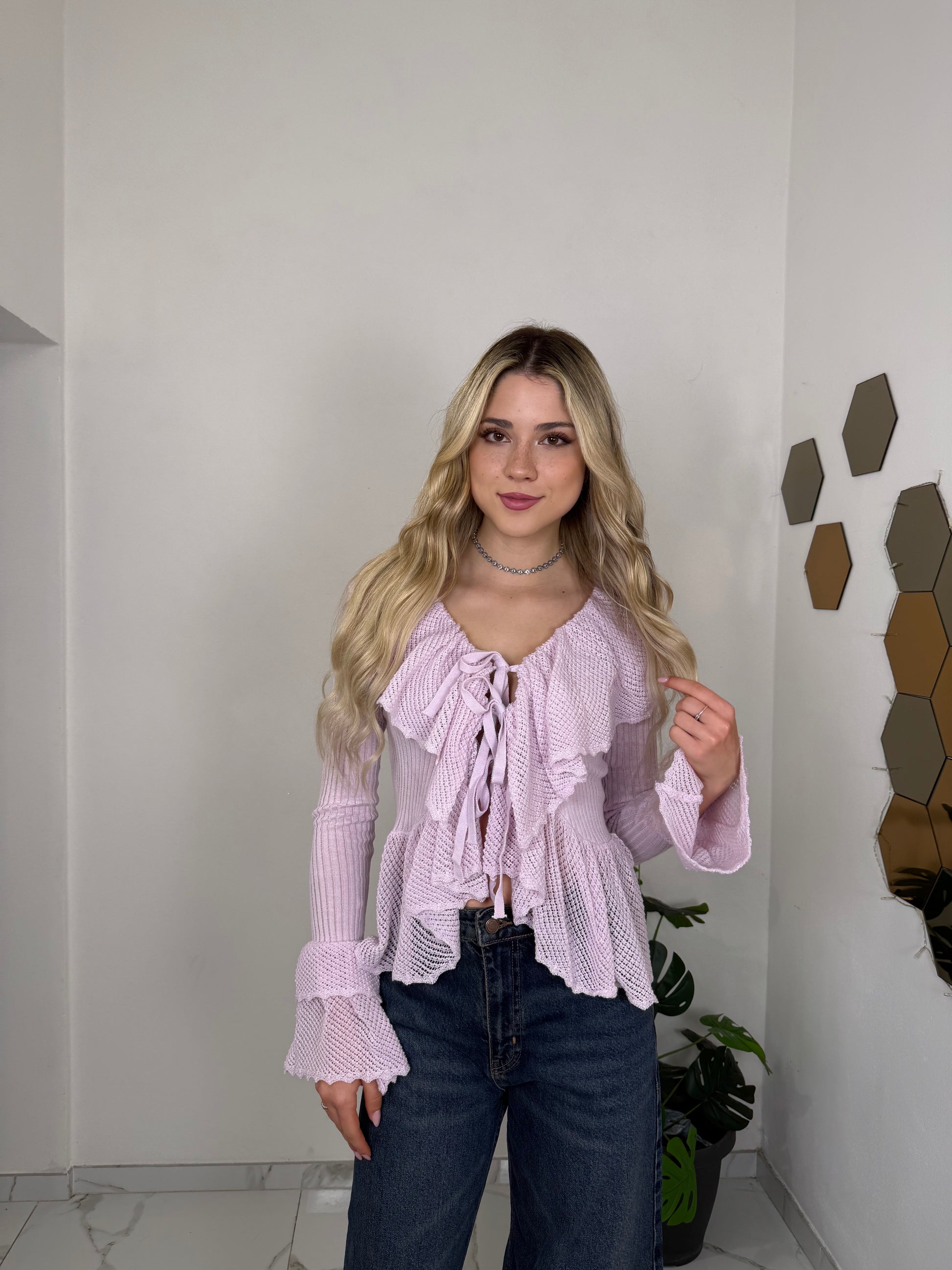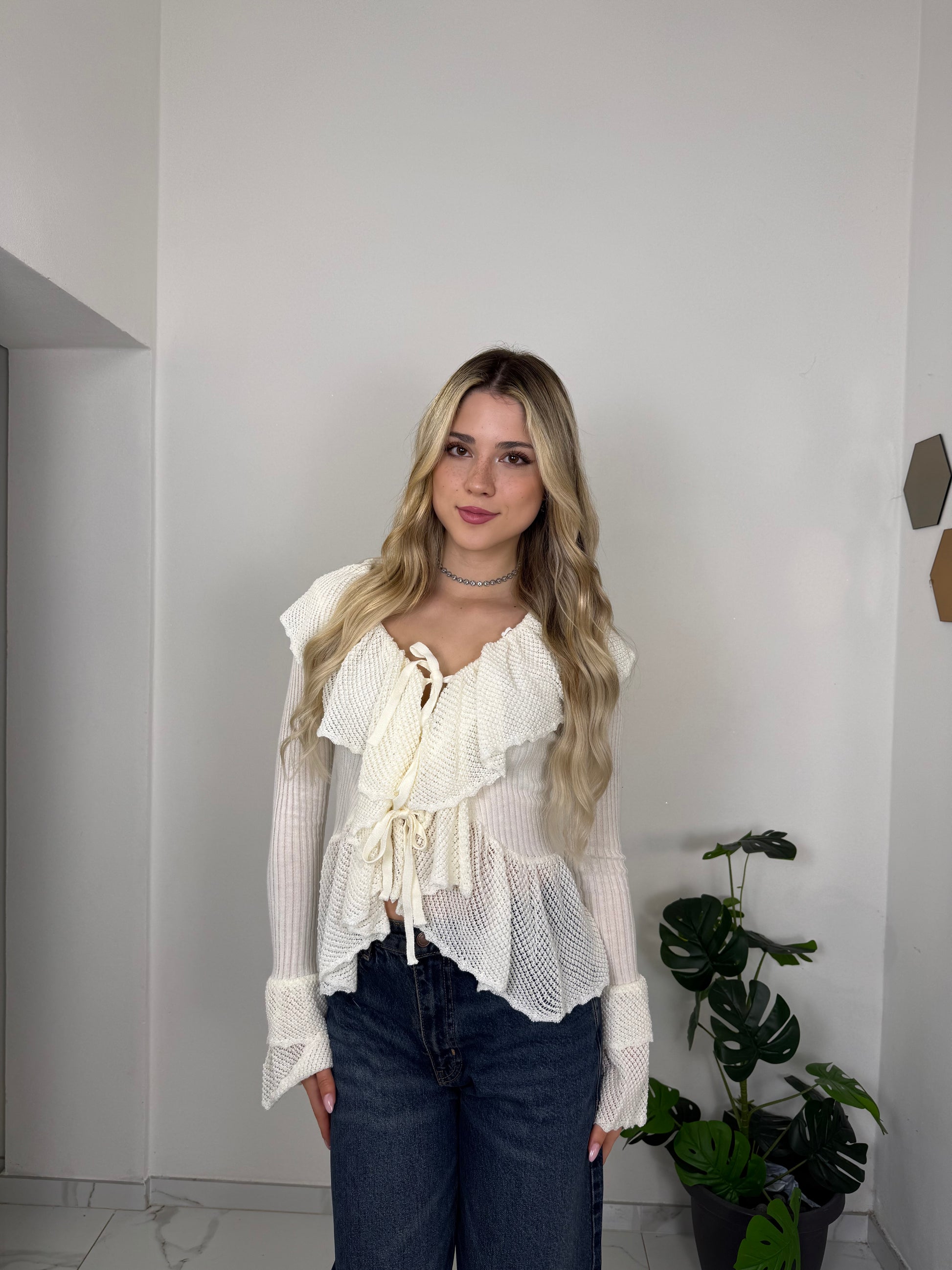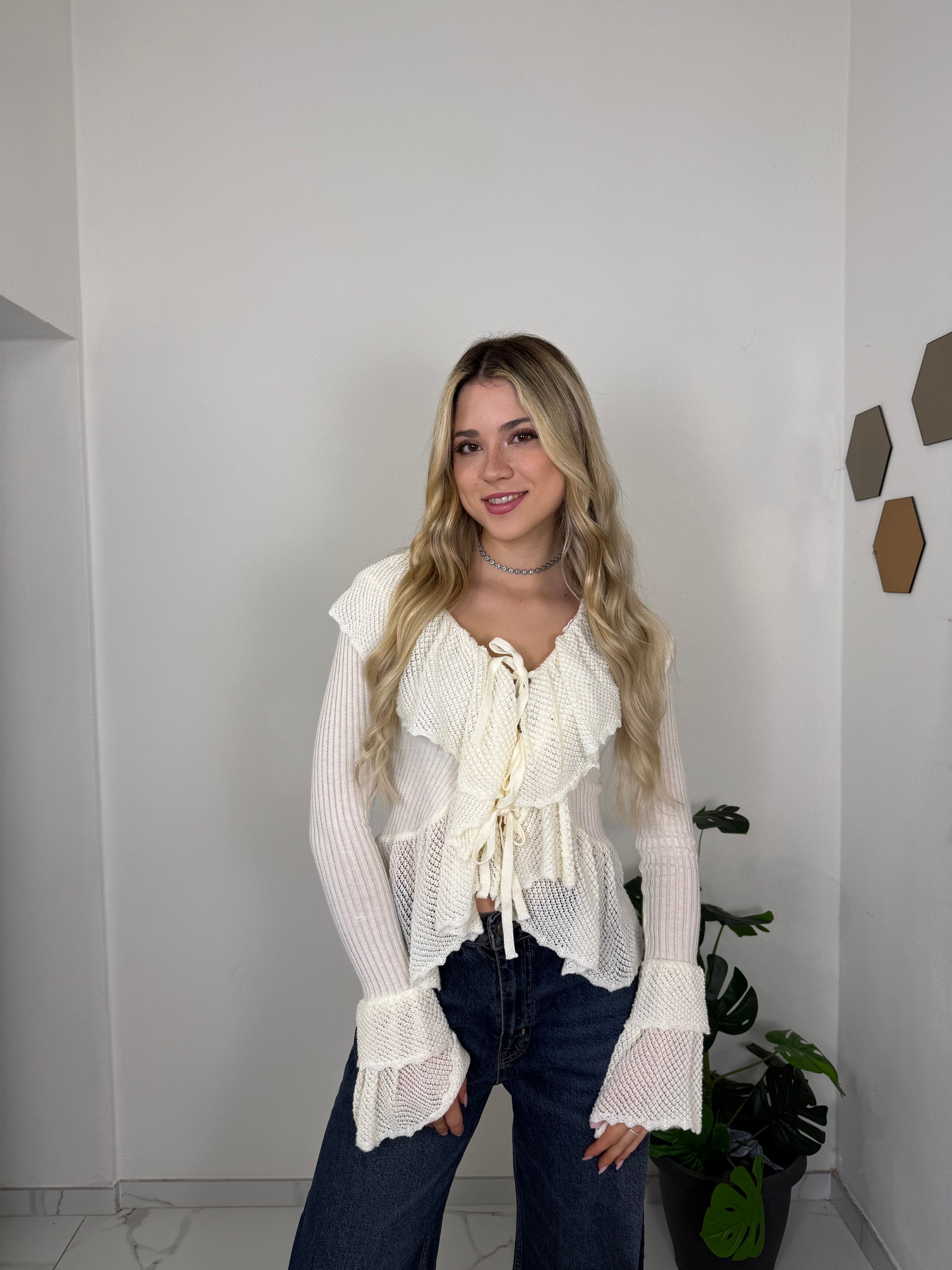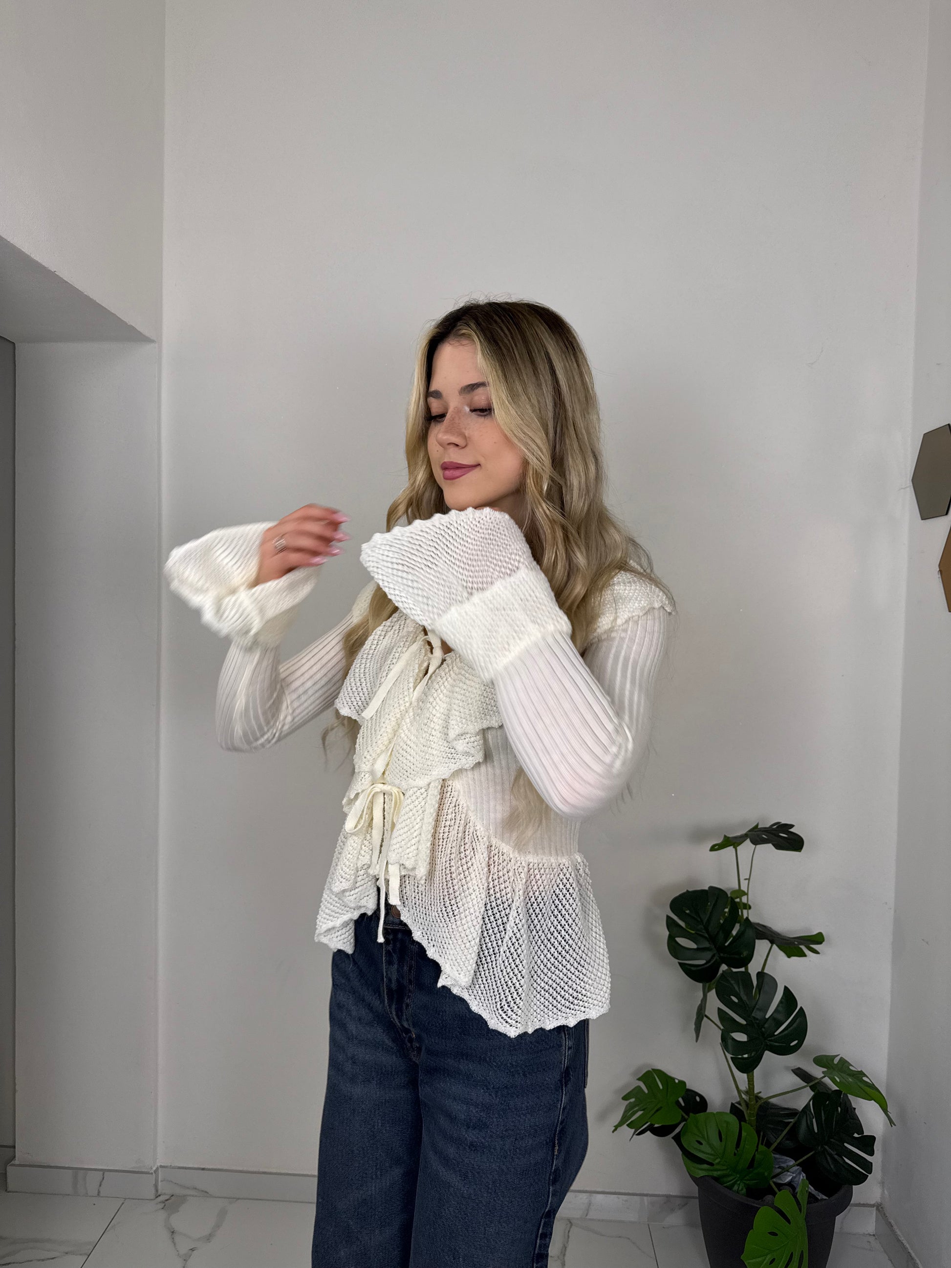Cardigan in maglia lavorata dal design femminile con ruches frontali e chiusura con laccetti regolabili. La texture morbida e traforata dona movimento e delicatezza, mentre le maniche leggermente svasate aggiungono un tocco bohémien chic. Perfetto da indossare con jeans a vita alta per un look casual raffinato o con gonne fluide per un outfit più romantico. Un capo versatile, ideale per la mezza stagione e per le serate estive più fresche.