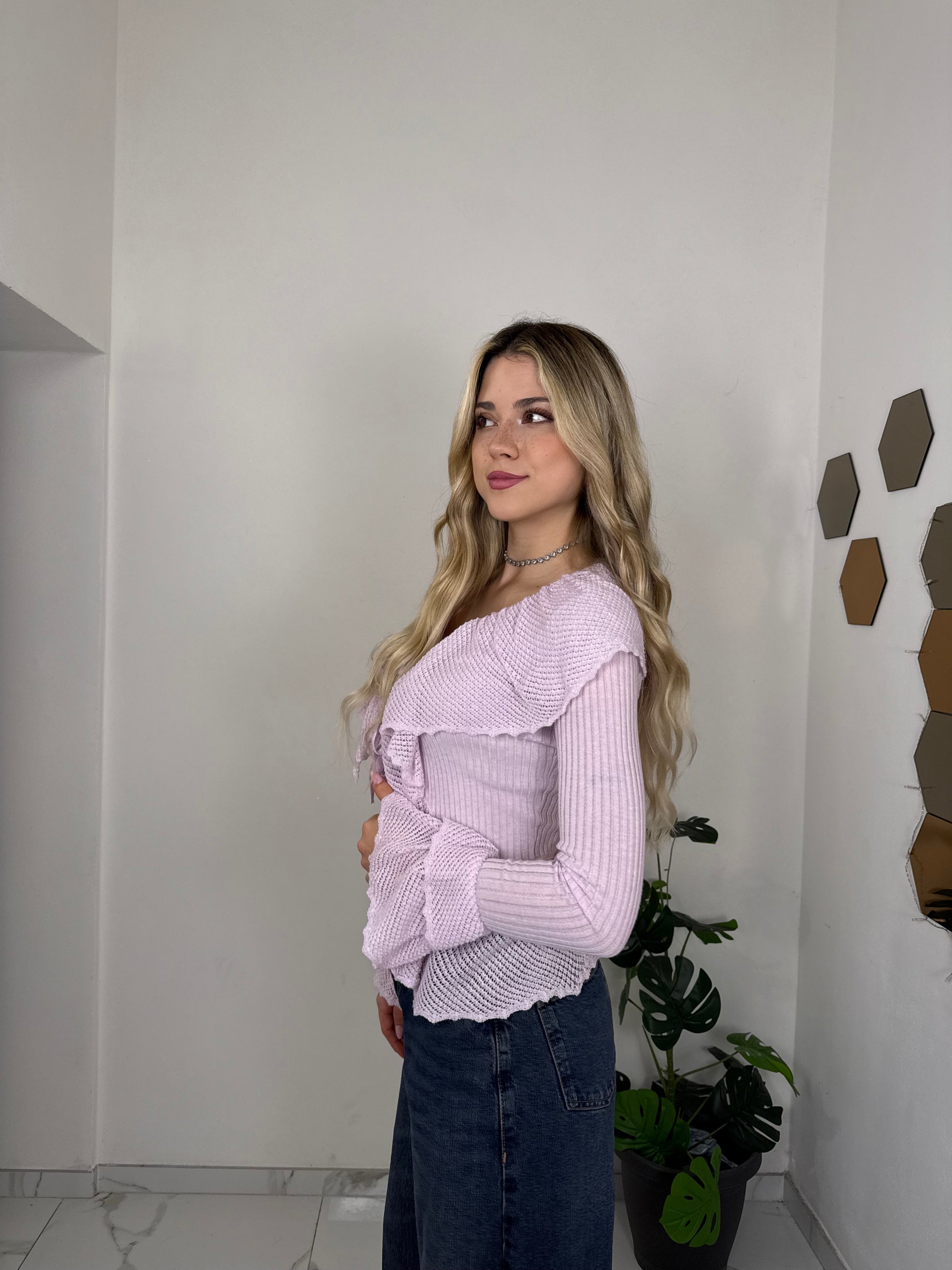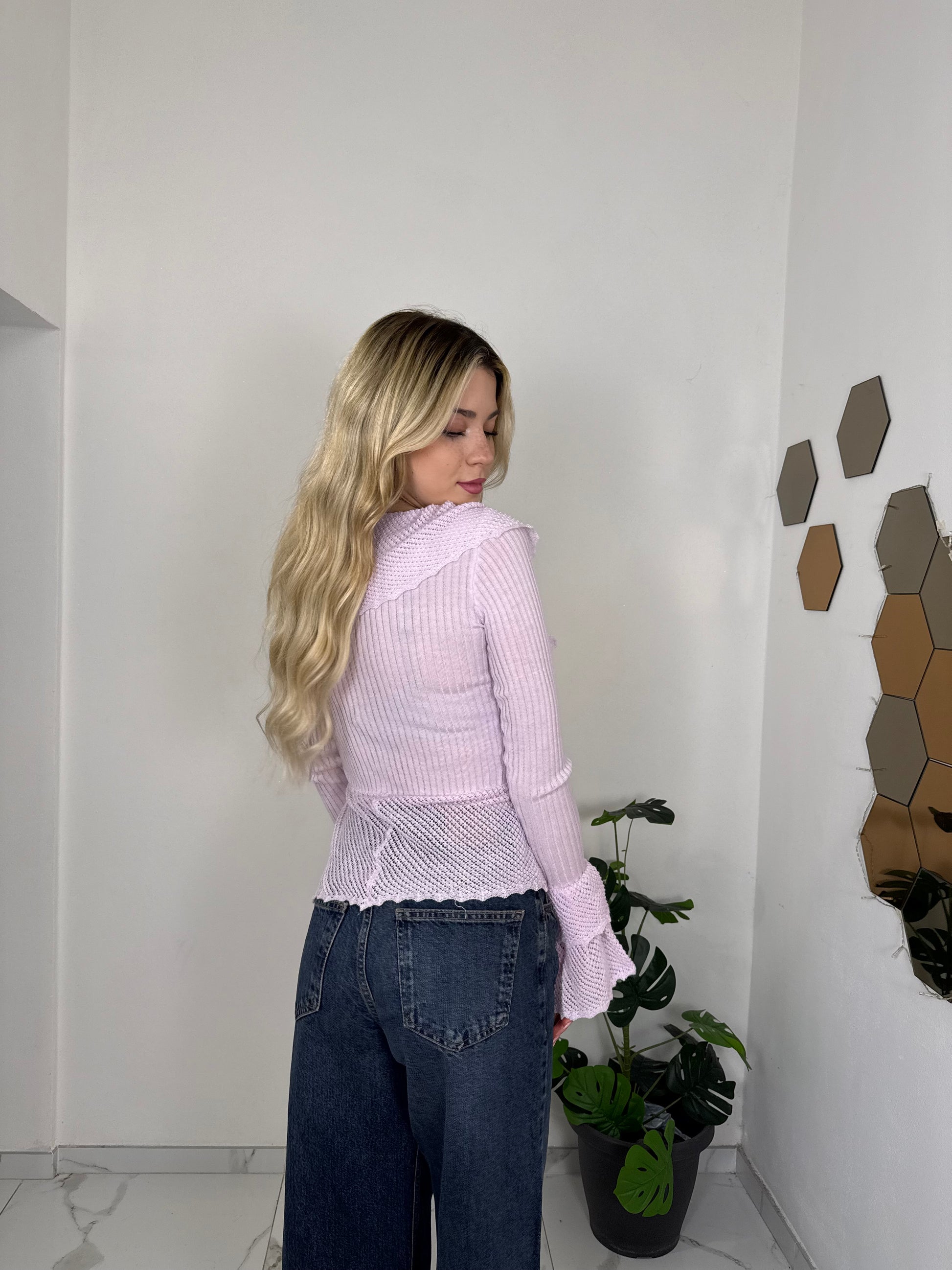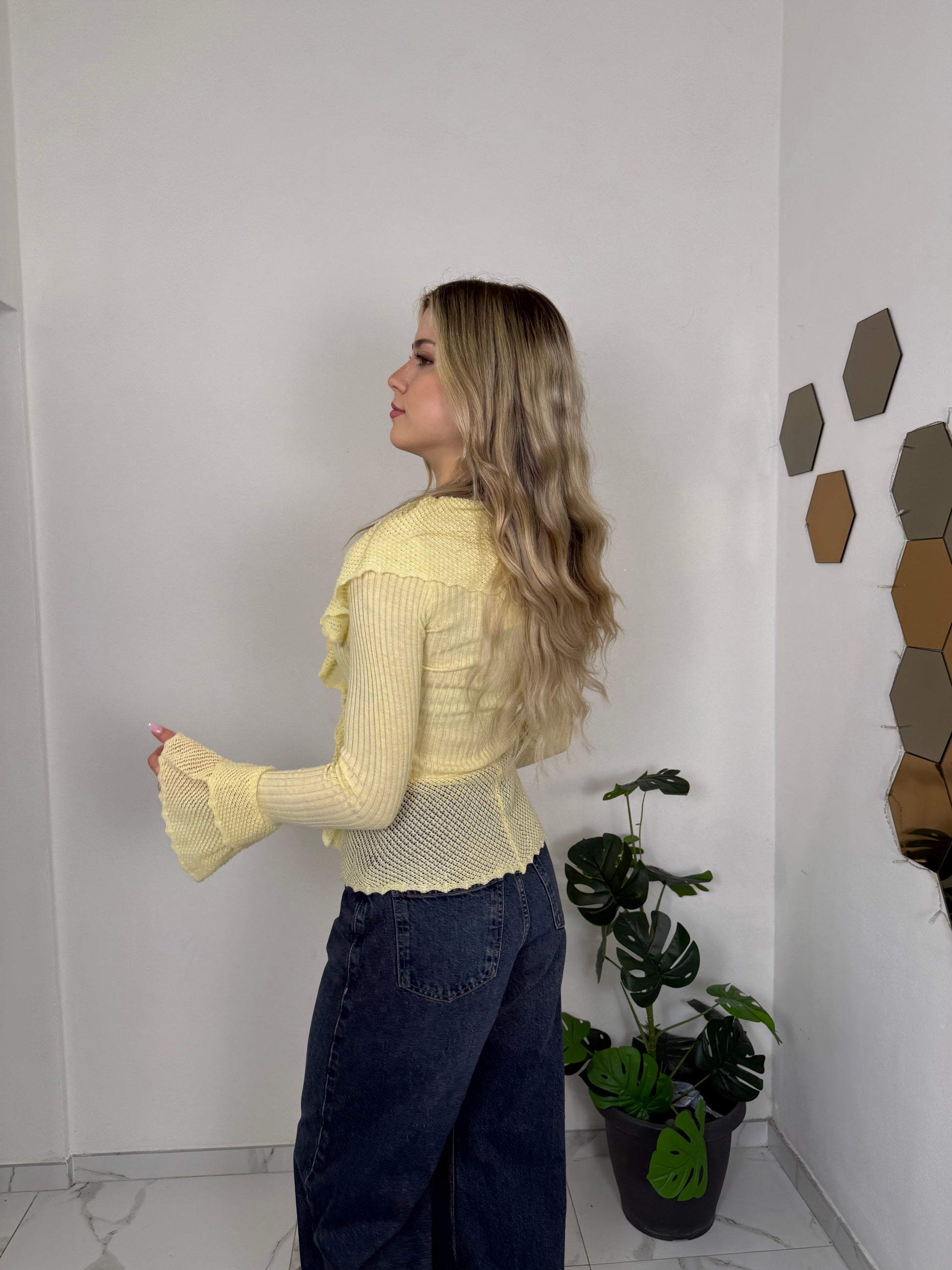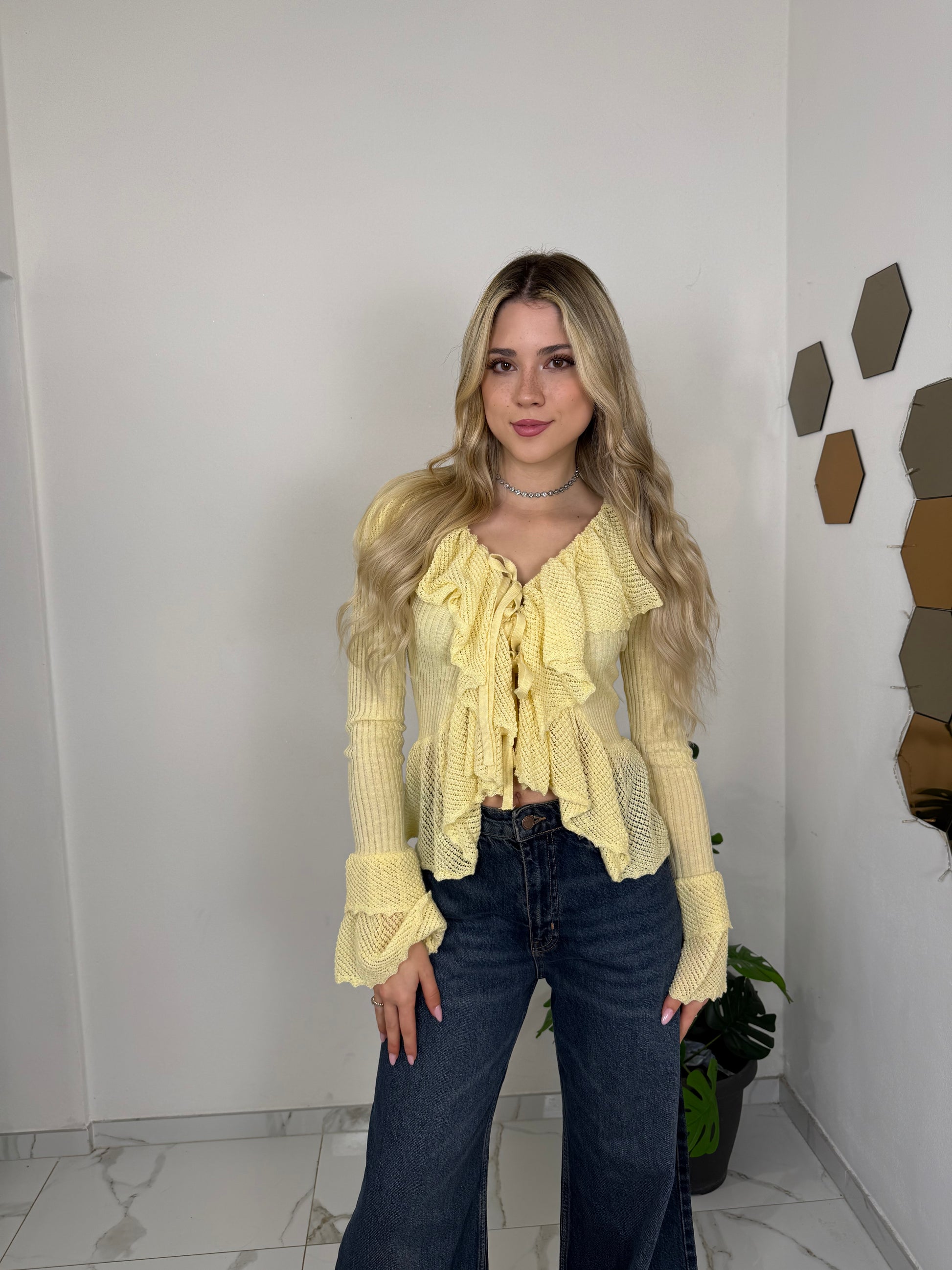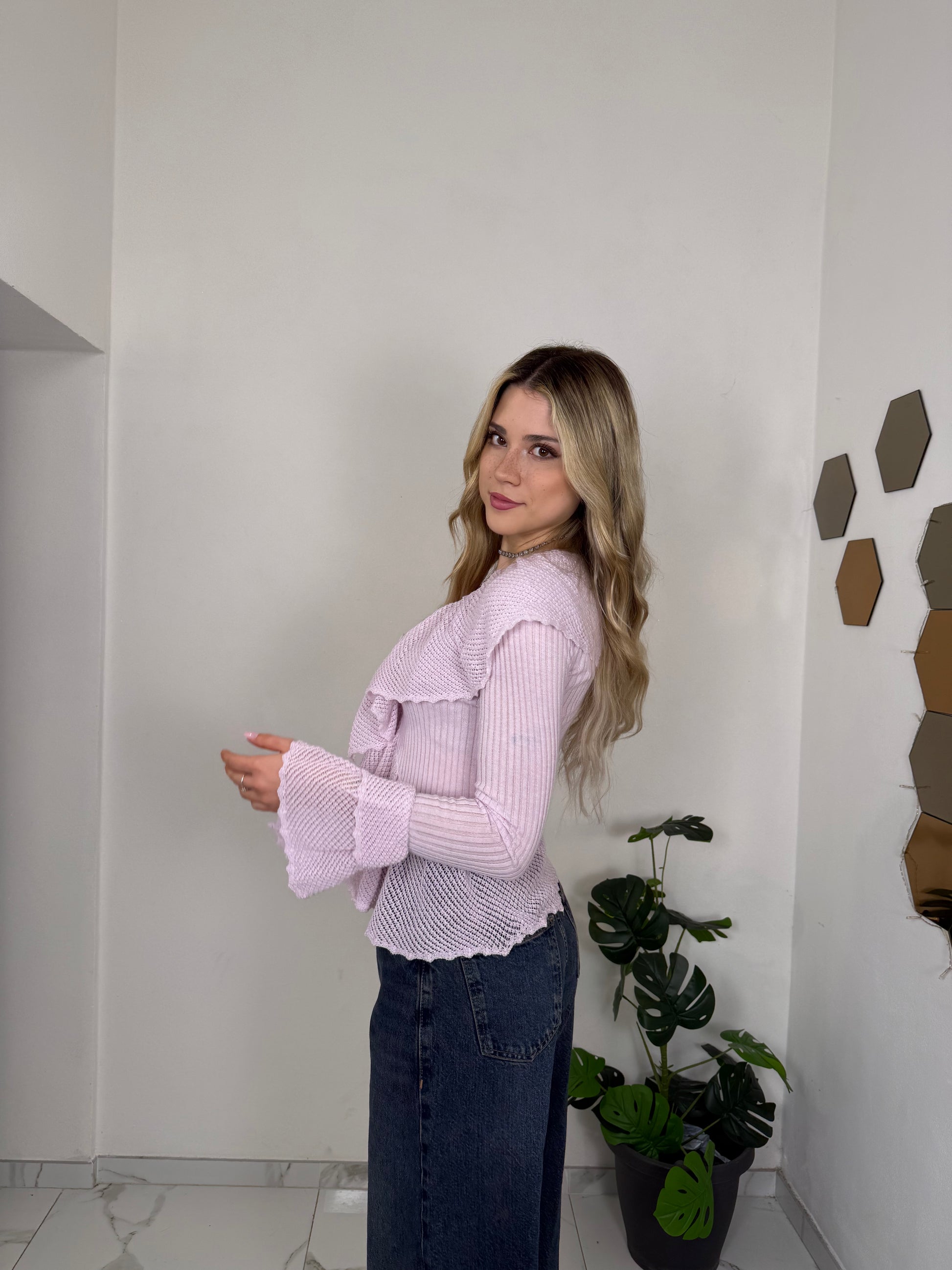 Cardigan in maglia lavorata dal design femminile con ruches frontali e chiusura con laccetti regolabili. La texture morbida e traforata dona movimento e delicatezza, mentre le maniche leggermente svasate aggiungono un tocco bohémien chic. Perfetto da indossare con jeans a vita alta per un look casual raffinato o con gonne fluide per un outfit più romantico. Un capo versatile, ideale per la mezza stagione e per le serate estive più fresche.