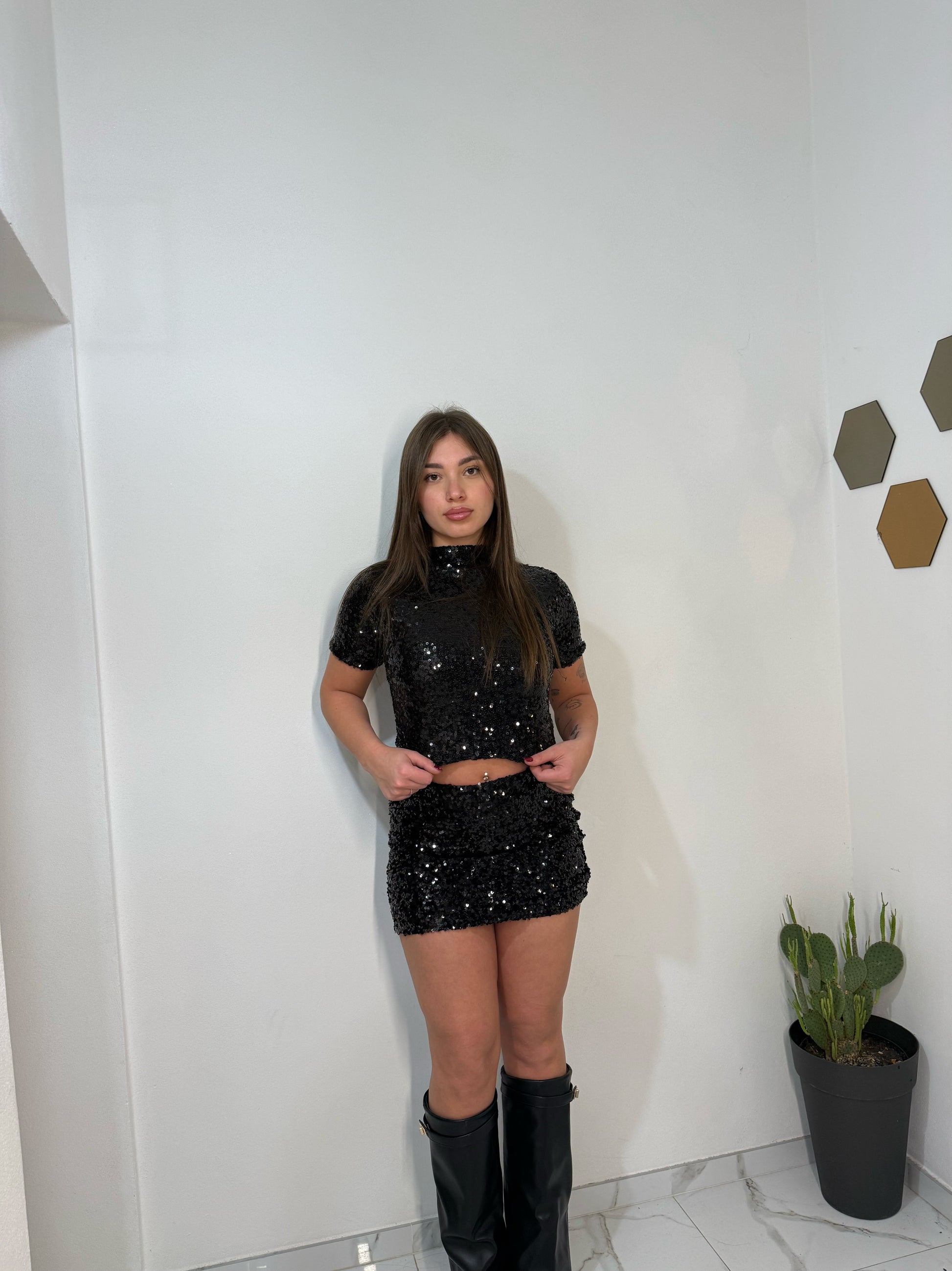 Coordinato nero composto da crop top a maniche corte con collo alto e gonna mini aderente. Realizzato in tessuto ricoperto di paillettes, è ideale per serate speciali e look sofisticati.