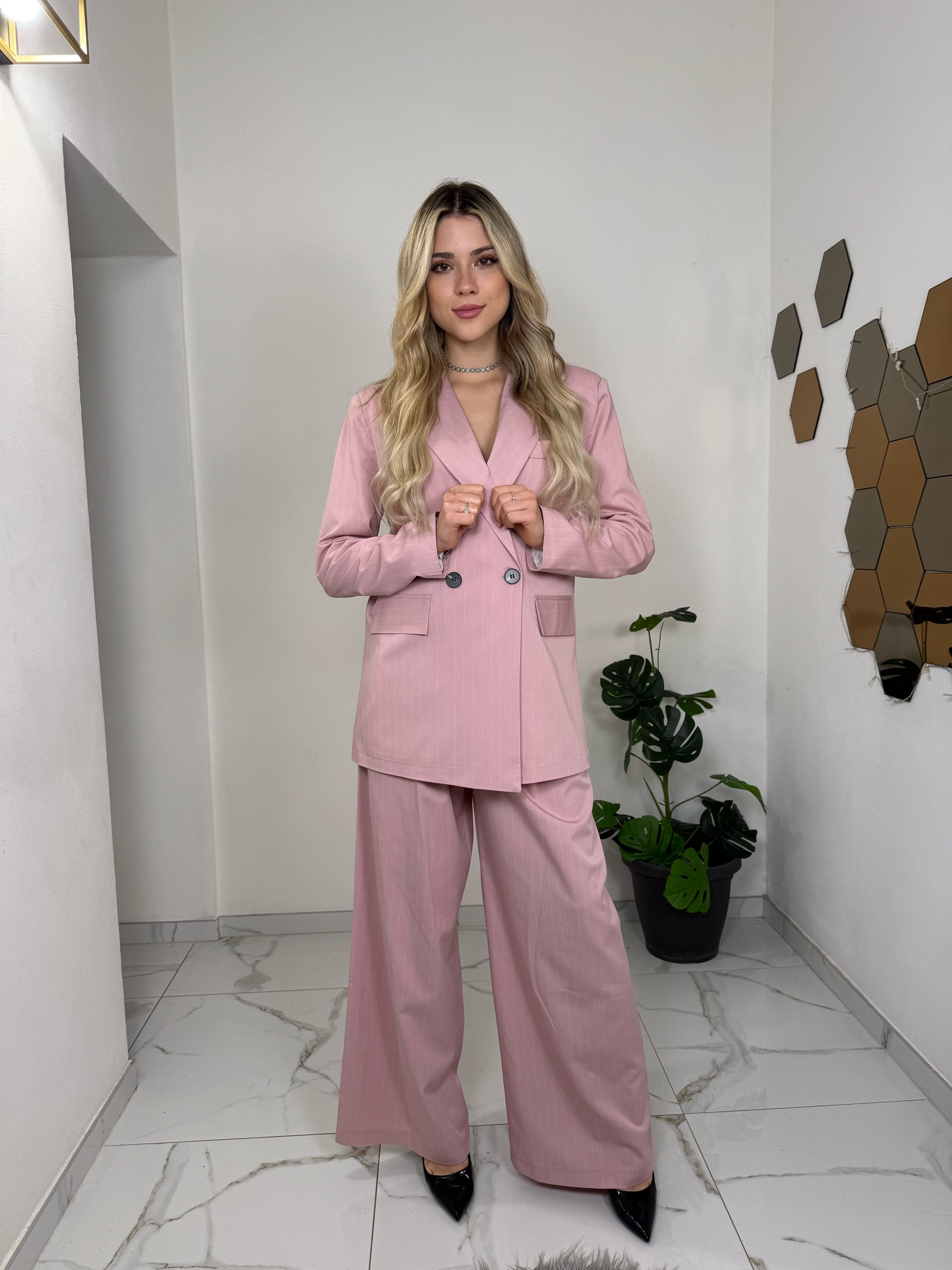 Tailleur composto da blazer doppiopetto e pantalone palazzo, pensato per chi ama distinguersi con classe. La linea morbida del pantalone si unisce alla struttura del blazer per creare un look sofisticato e femminile, perfetto per eventi, ufficio o occasioni speciali.