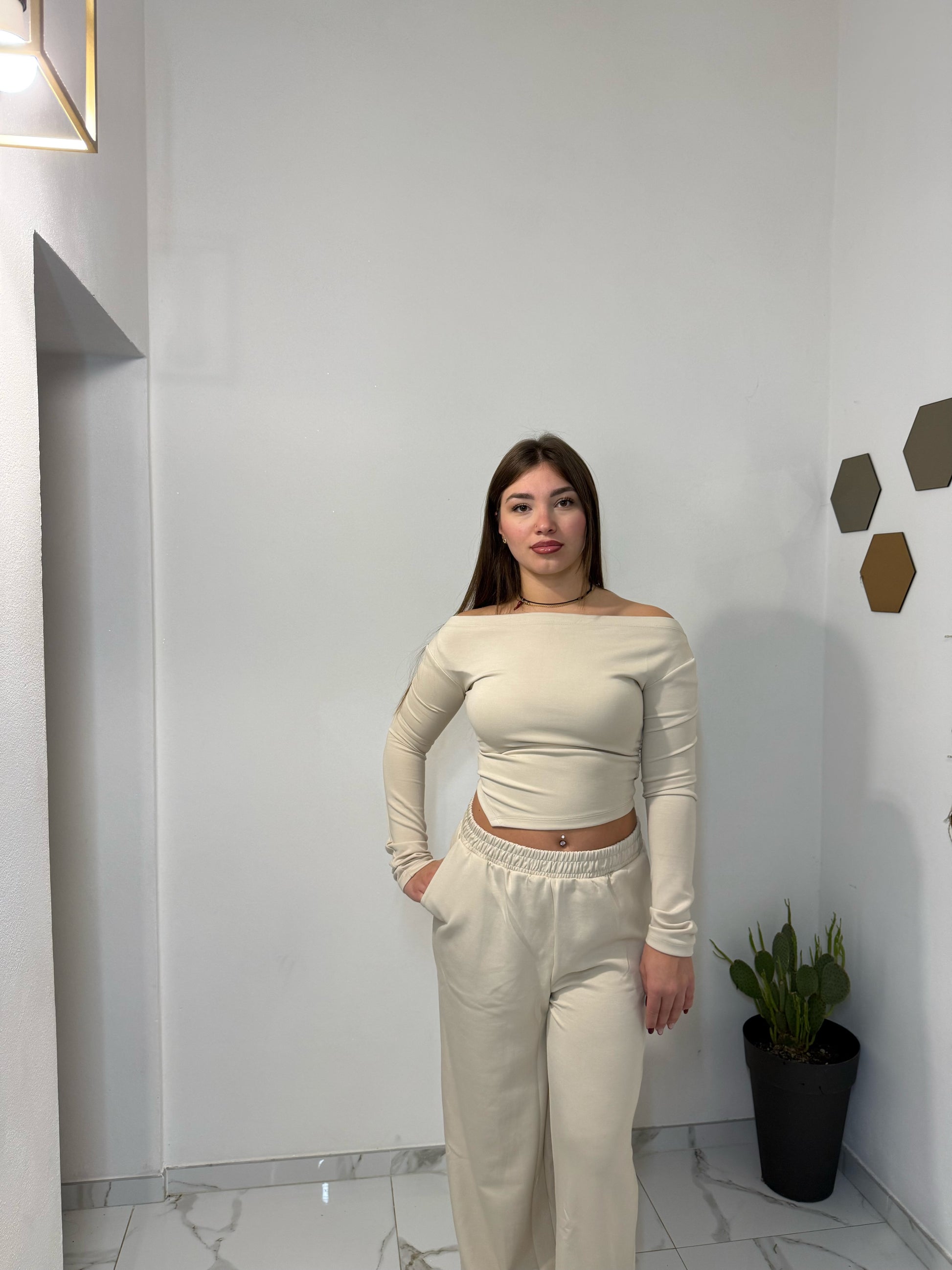 Coordinato beige composto da crop top a maniche lunghe con scollo dritto e pantalone a gamba larga con vita elasticizzata. Realizzata in tessuto morbido ed elasticizzato, è perfetta per i momenti di relax o per un look casual ma curato.