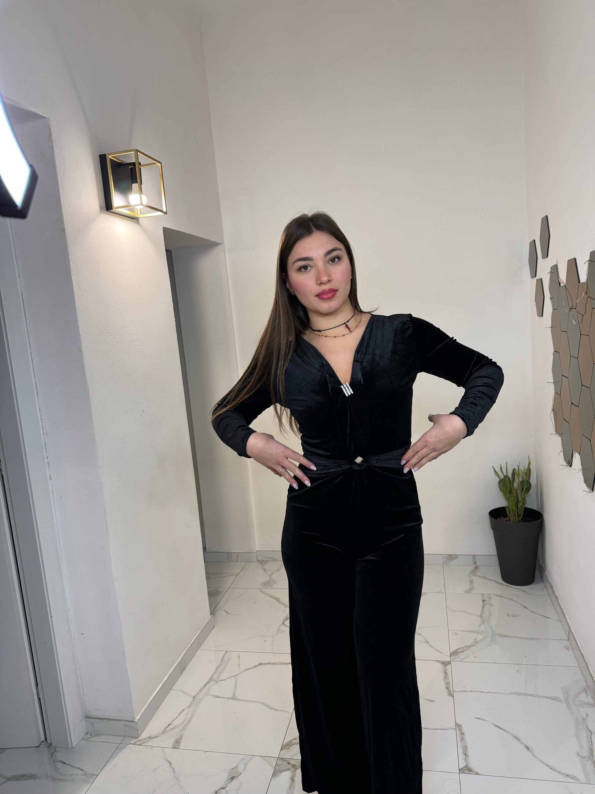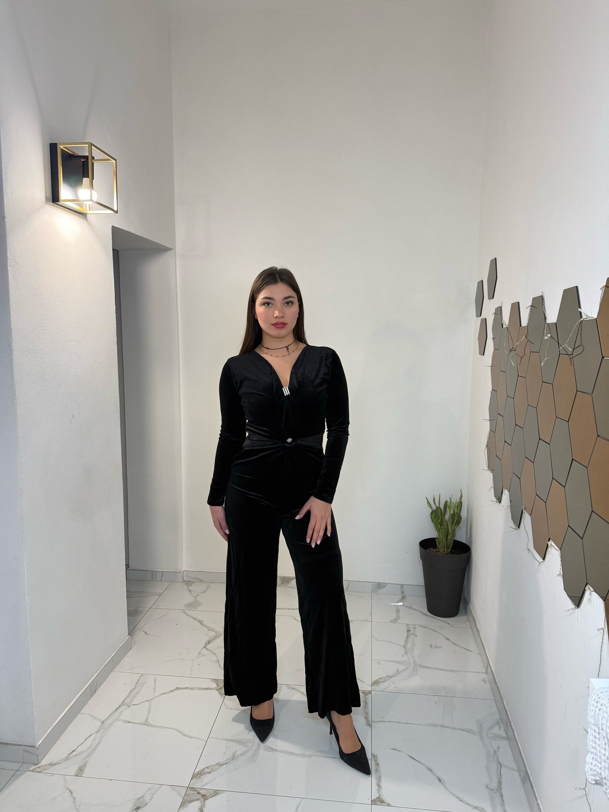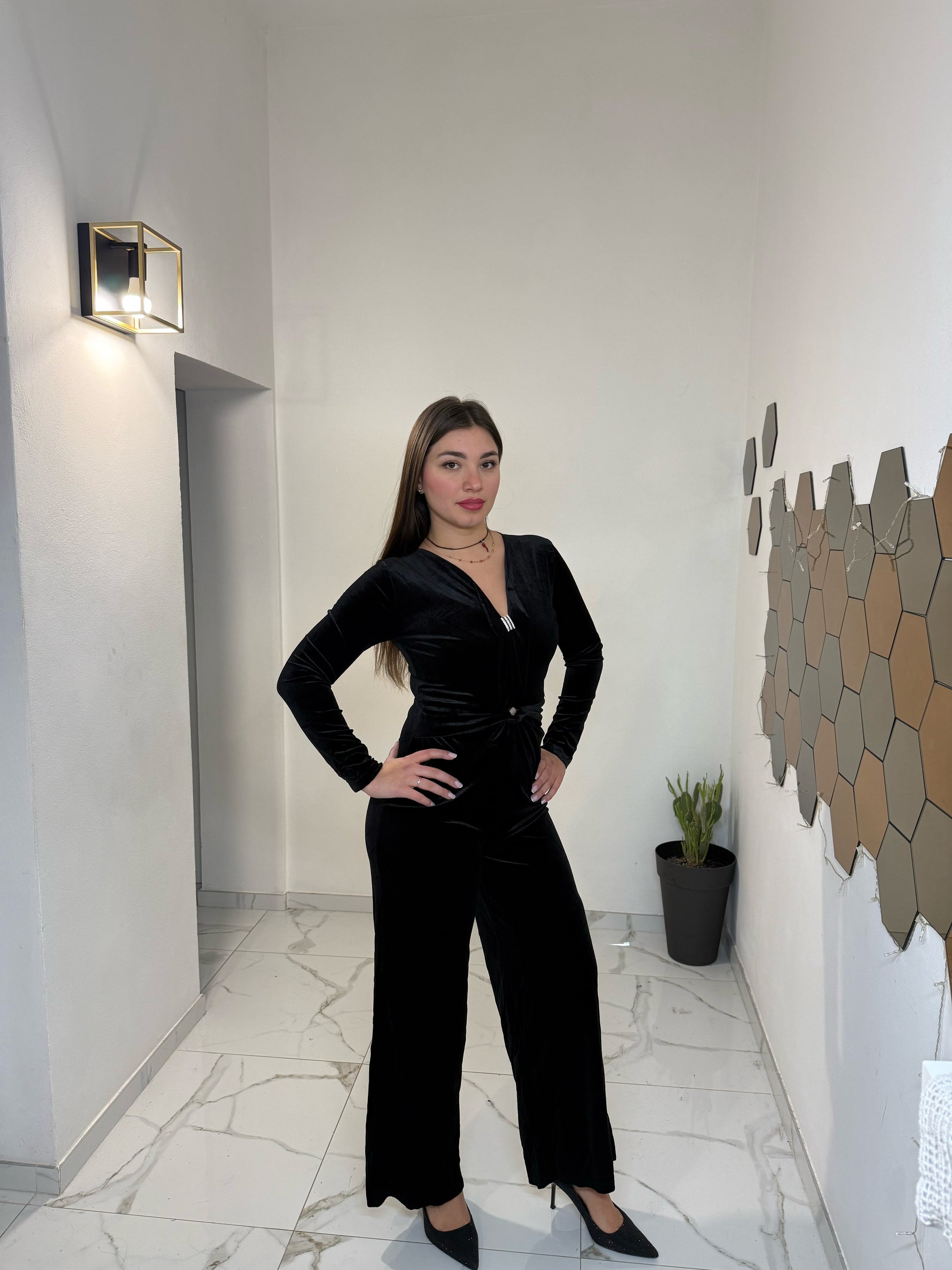 Tuta lunga in velluto nero, con scollo incrociato e dettaglio arricciato in vita per valorizzare la silhouette. Gamba ampia, tessuto morbido e confortevole. Perfetta per eventi serali o look raffinati senza sforzo.