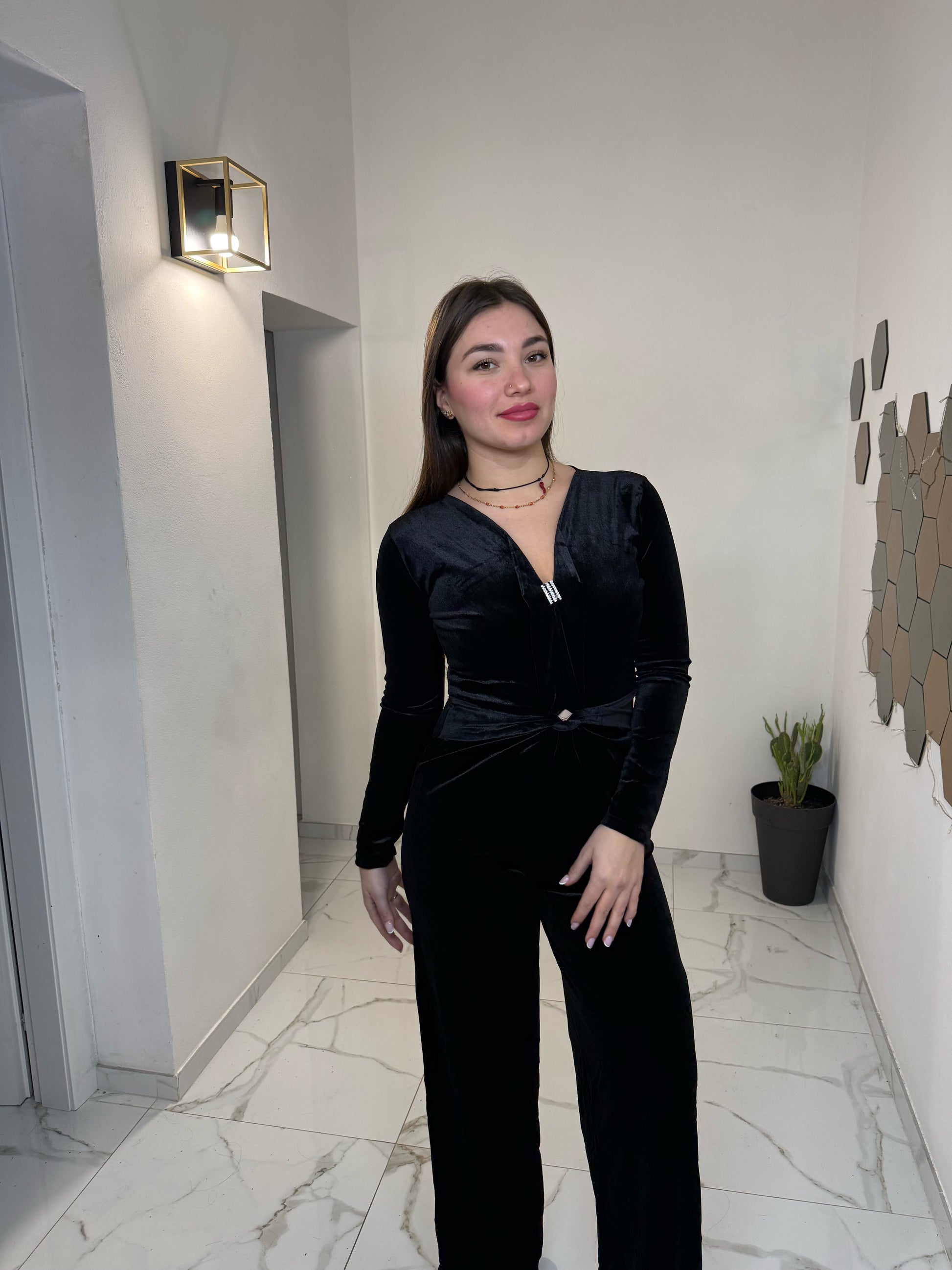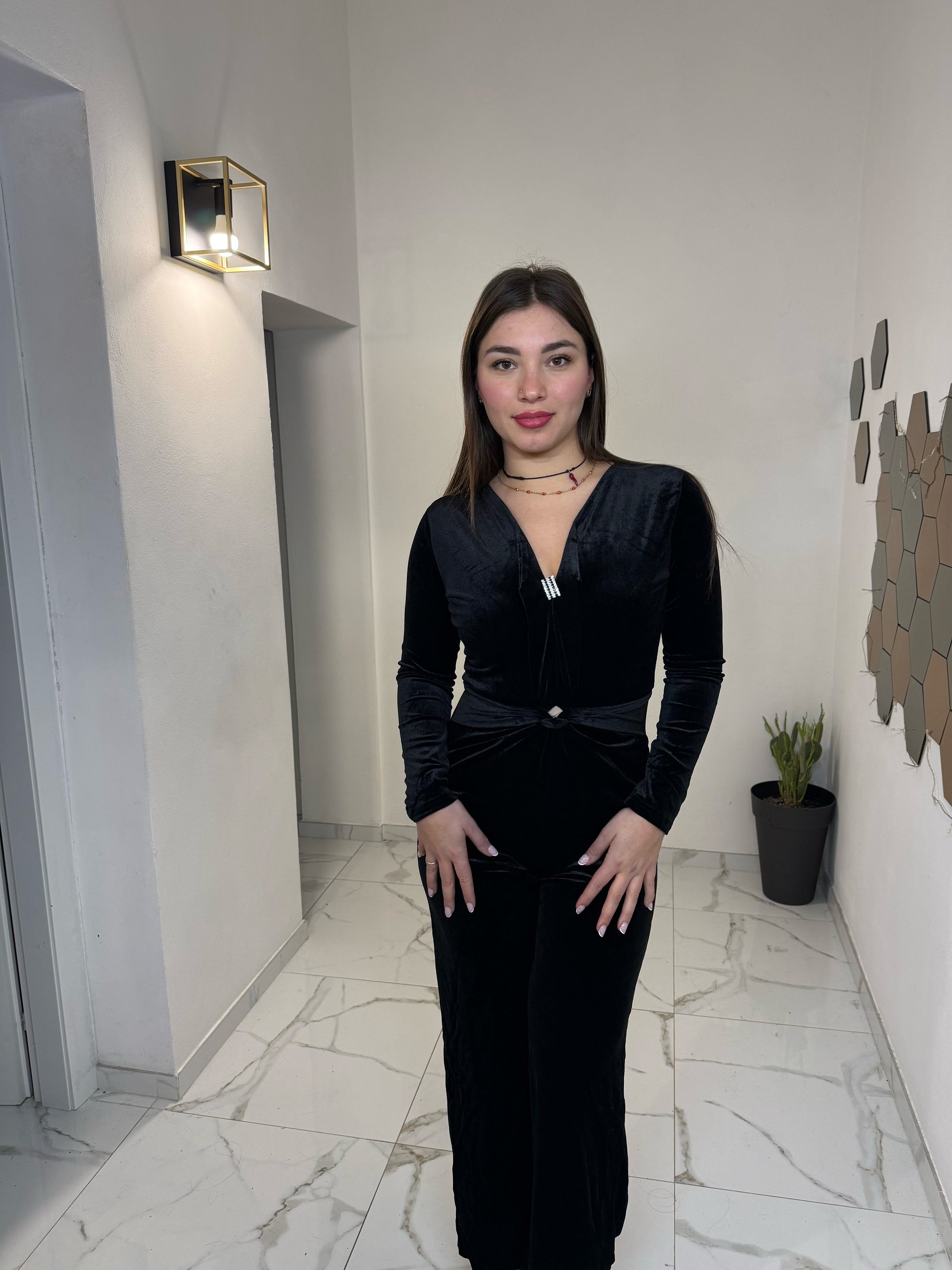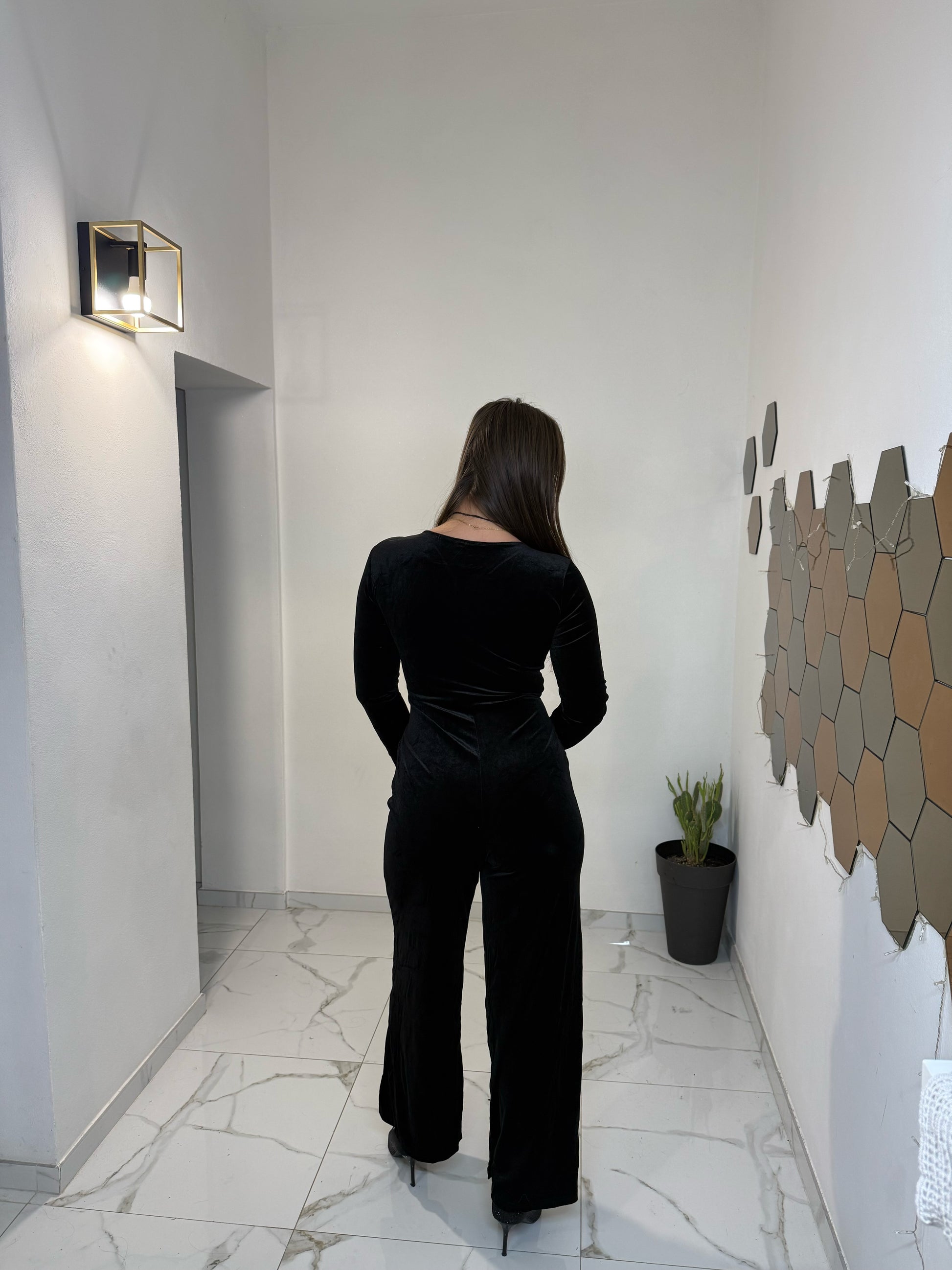 Tuta lunga in velluto nero, con scollo incrociato e dettaglio arricciato in vita per valorizzare la silhouette. Gamba ampia, tessuto morbido e confortevole. Perfetta per eventi serali o look raffinati senza sforzo.
