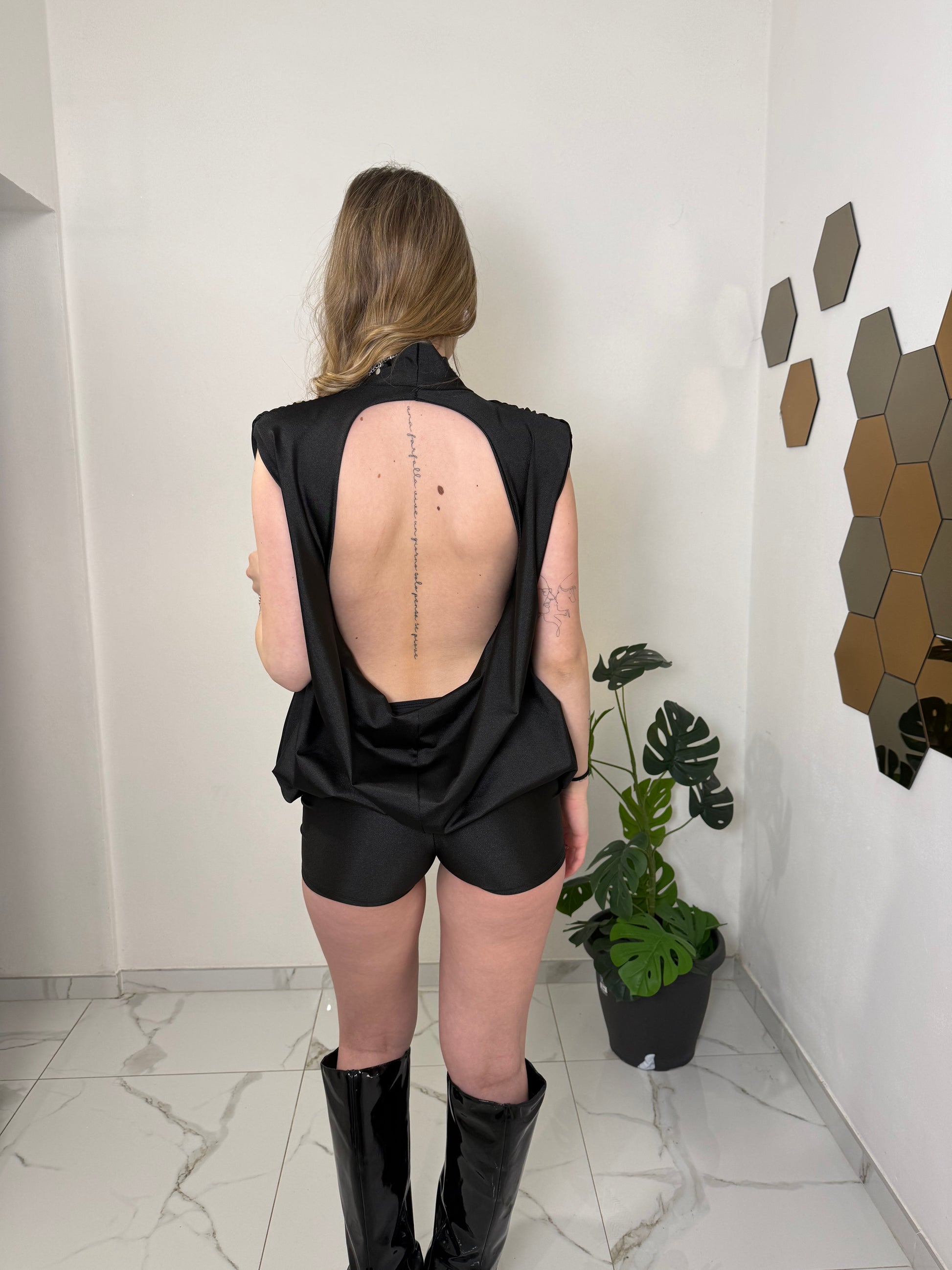 Tutina dal design contemporaneo caratterizzata da linee pulite e da una scenografica scollatura sulla schiena che dona un tocco sensuale e raffinato. La parte superiore morbida crea un elegante effetto drappeggiato, mentre il fondo aderente valorizza la silhouette con equilibrio e armonia.